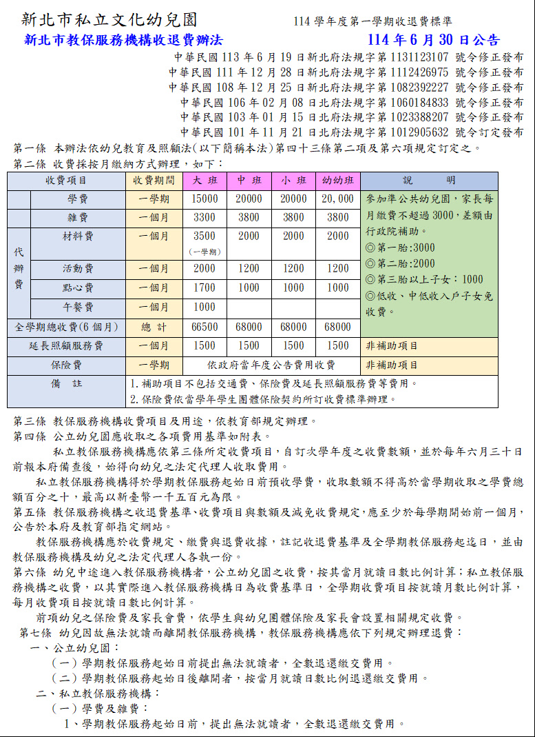 114學年度第一學期-新北市教保服務機構收退費辦法